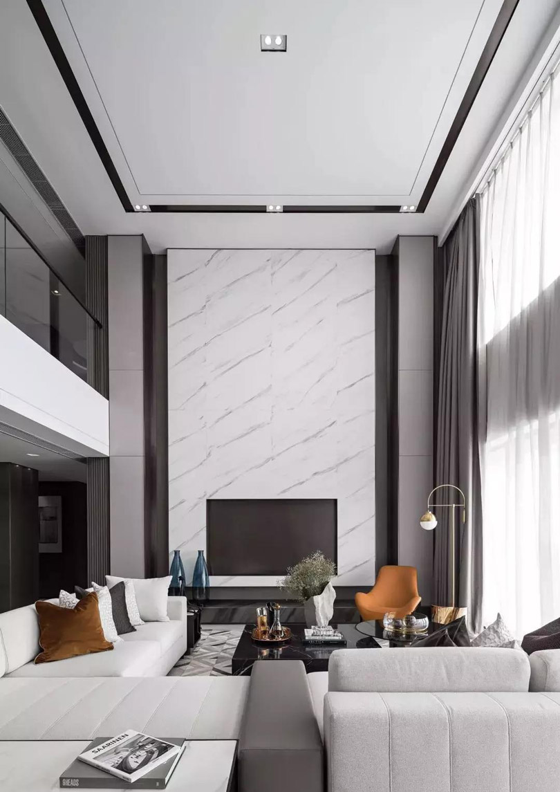 挑高空間設計吊頂,一般需要搭配燈飾以及單層/多層的裝飾線條進行修飾。