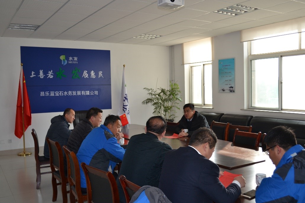 2019年1月8日,昌樂(lè)縣委常委統(tǒng)戰(zhàn)部部長(zhǎng)陳新廠一行到昌樂(lè)藍(lán)寶石水務(wù)發(fā)展有限公司進(jìn)行現(xiàn)場(chǎng)調(diào)研,昌樂(lè)縣環(huán)保局張春明局長(zhǎng)、高春平書記以及昌樂(lè)藍(lán)寶石水務(wù)發(fā)展有限公司董事長(zhǎng)王俊忠陪同。